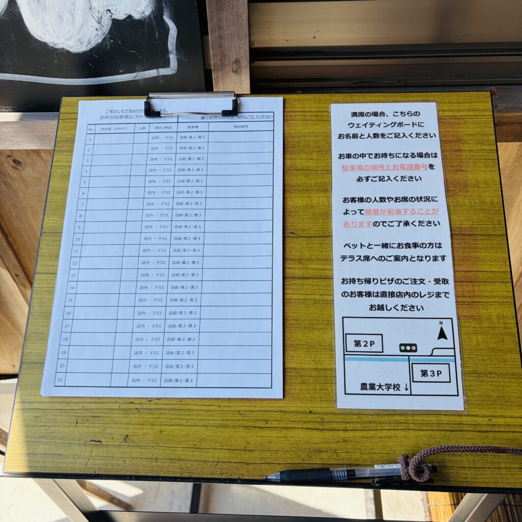 満席の時は、ここに名前を書いて待ちます。(駐車場と電話番号を書いておくと車の中で待てるよ)
